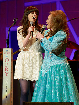 Lynn personally introduced Deschanel Thursday night on the stage of Nashville's historic Ryman Auditorium during Opry Country Classics. The two then sang "Coal Miner's Daughter."